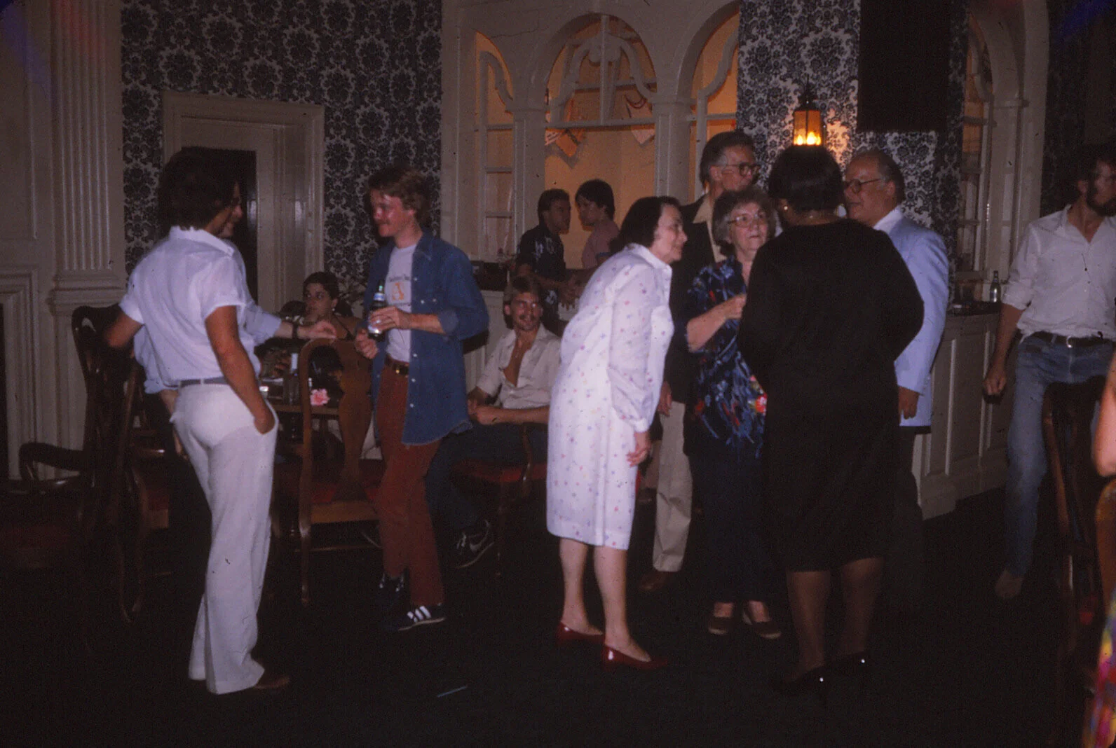 Andrews Inn, circa 1981. Pictured Fletcher Proctor (red pants, blue shirt), Bryan Murphey (back to the camera). Photo by Jeremy Youst. Collection of Andrews Inn Oral History Project.