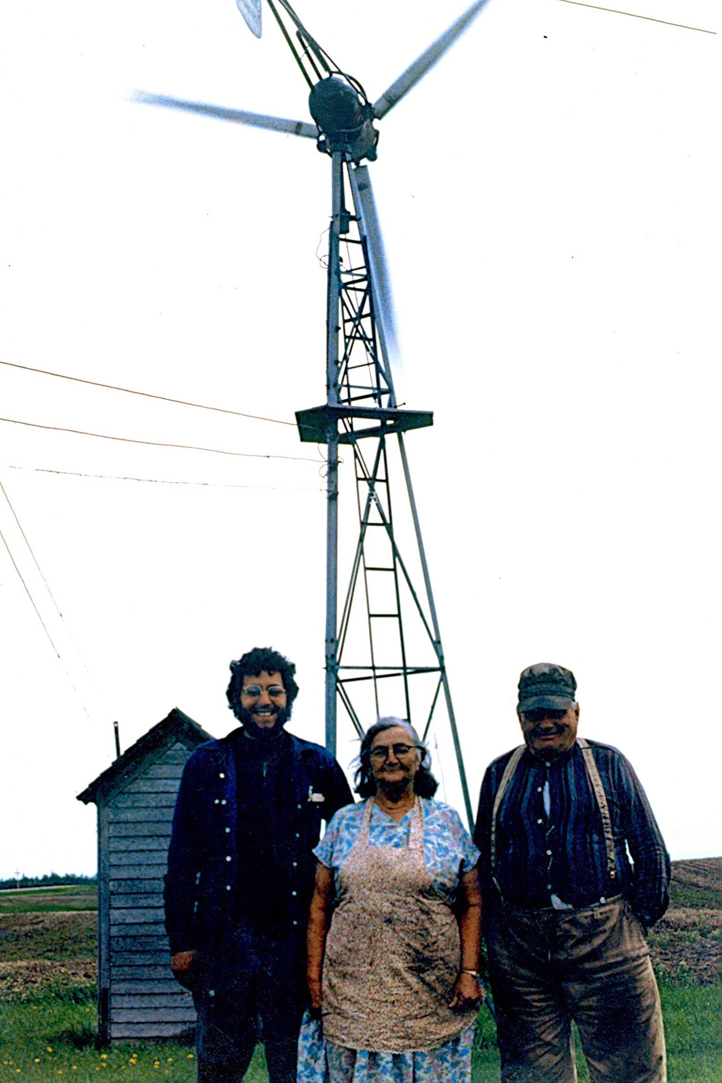 Archival photo of Don Mayer (center) pictured with Mr. & Mrs. Eldy Schragg, who were responsible for teaching him about the Jacob’s Wind Generators. Photo courtesy of Don Mayer.