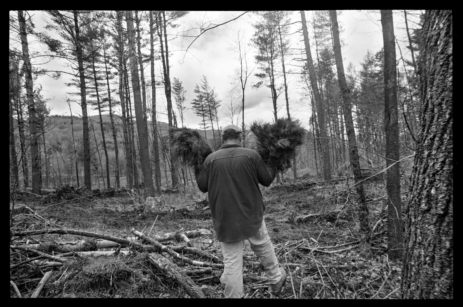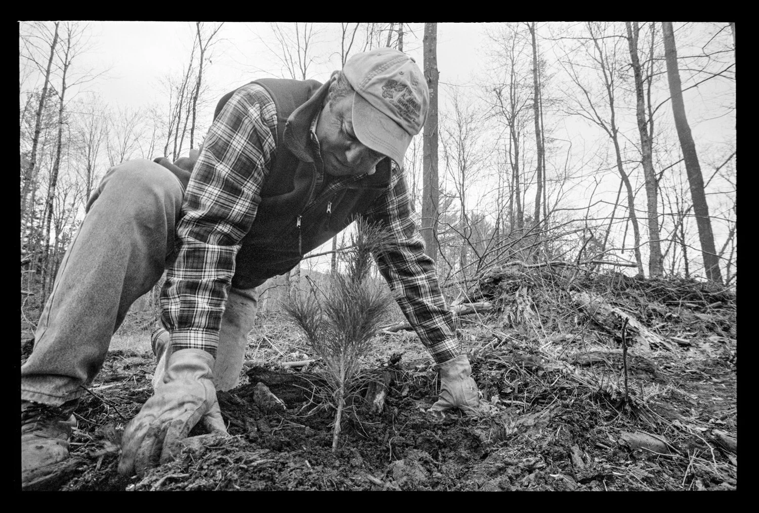 Foresters are the traffic cops of the woods. They evaluate wood lots for their economic potential and ecological value and develop management plans that combine sustainable cutting with habitat protection. But much of their mandate is to think generationally. How can today’s forests be improved by eliminating “weeds” and by promoting high-value species? Tom Yager, the dean of area foresters, has worked for A. Johnson in Bristol, one of the state’s largest mills, for 40-plus years. His job, very simply, is to “feed the beast”—a mill that directly employs 30-plus people and requires a constant diet of logs. The following documentation illustrates two of his jobs: laying out access roads to new wood lots, and planting pine seedlings for harvesting in 50-plus years.