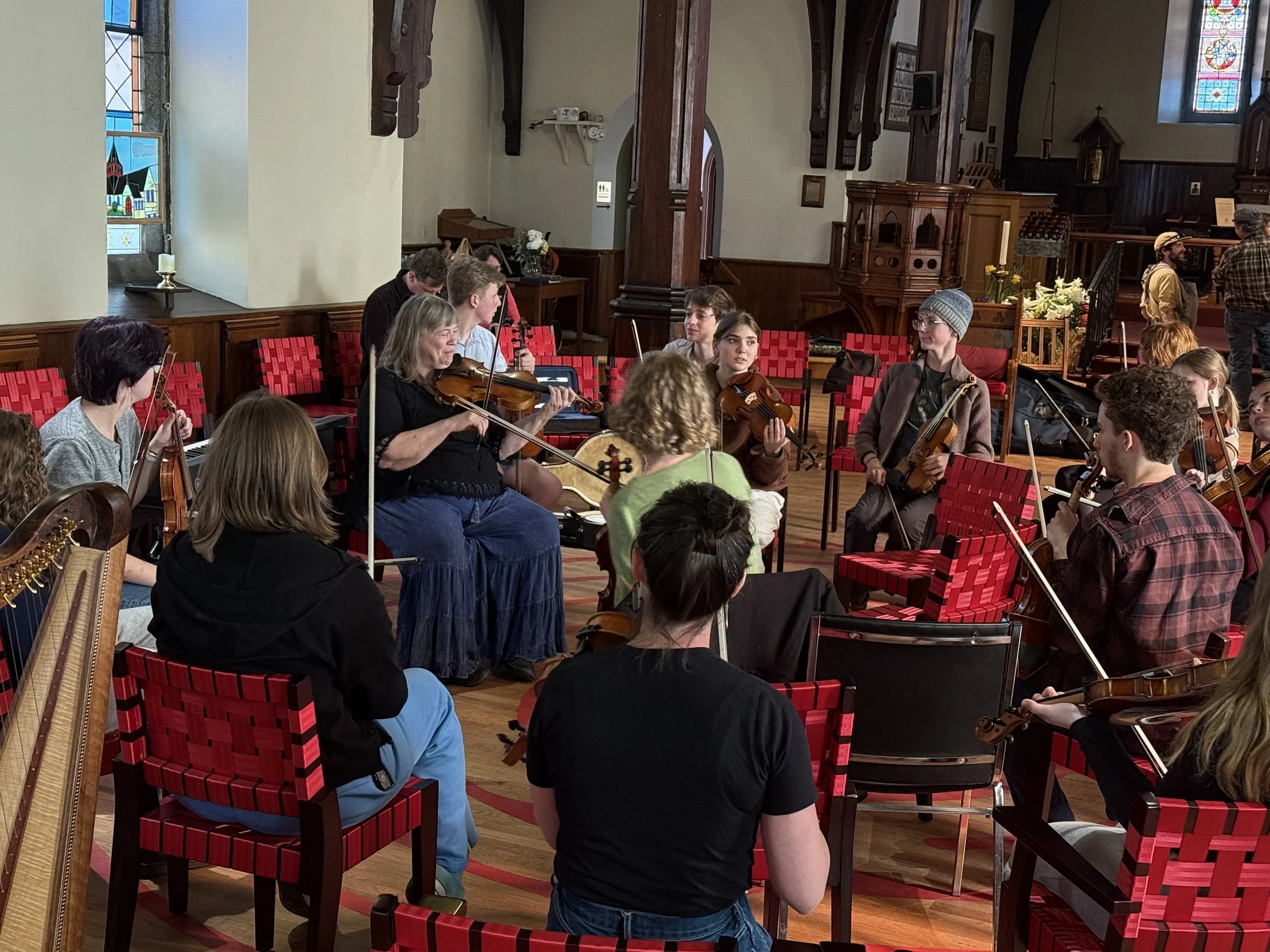 On Wednesday April 23rd, we loaded up on the coach with our dear coach driver, Walter White. Walter was our coach driver when the group toured Cape Breton and we were mutually elated that we could work together again. We knew we were in good hands as we headed off to Lewiston Maine. In Lewiston we were lucky to catch a performance of Palaver Strings and have an opportunity to have a Q & A session with them post performance. After meeting with Palaver Strings we transitioned into a jam session led by the one and only Greg Boardman. A big thank you to Greg for his time and assistance in arranging the performance space for the group at the Trinity Church of Lewiston. After the jam we worked with Ellen and John Gawler, of the Gawler Family Band (and Elsie’s parents), learning a great fiddle tune from Ellen and rousing songs from John. We ended the night with Ellen Gawler's Pineland Fiddlers opening for the Touring Group’s performance for a most welcoming and appreciative audience in Trinity Commons.