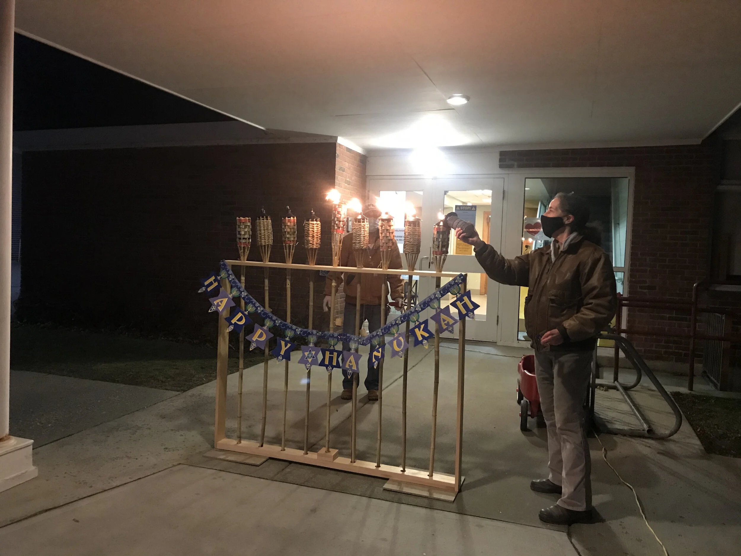 The tiki-torch menorah at Ohavi Zedek Synagogue: